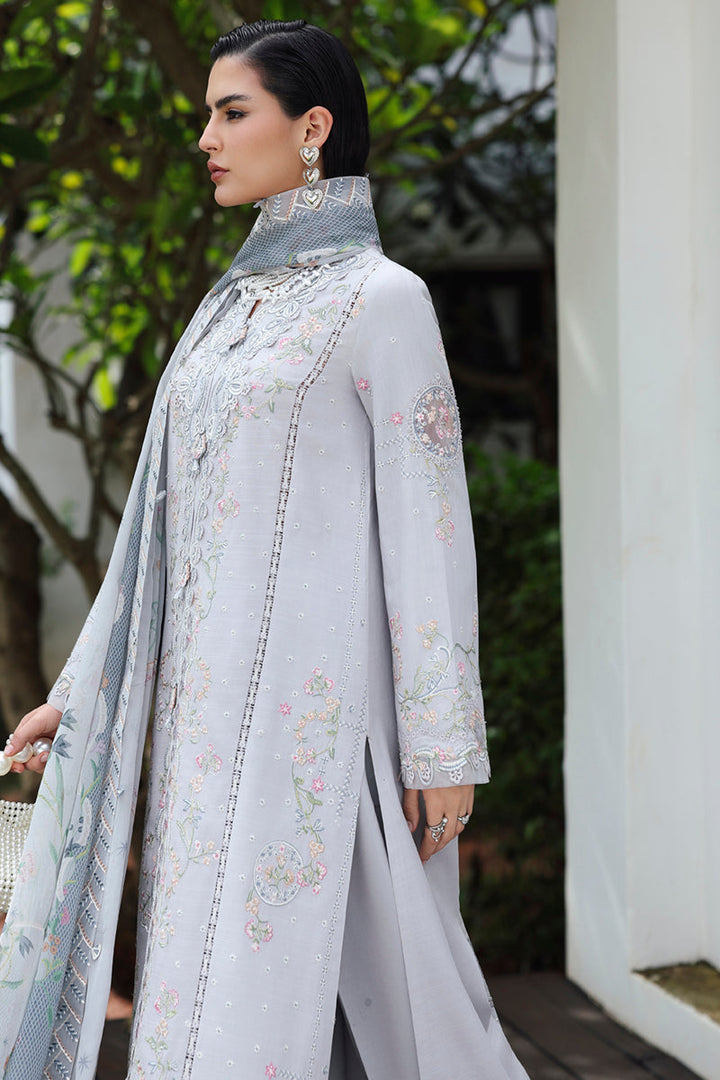 A beautifully crafted outfit featuring intricate embroidery and digital printed chiffon dupatta, finished with delicate tassels and lace for an elegant look.
