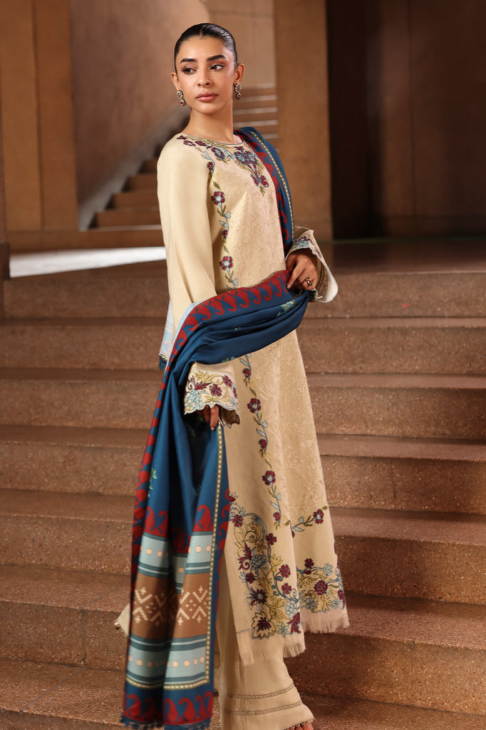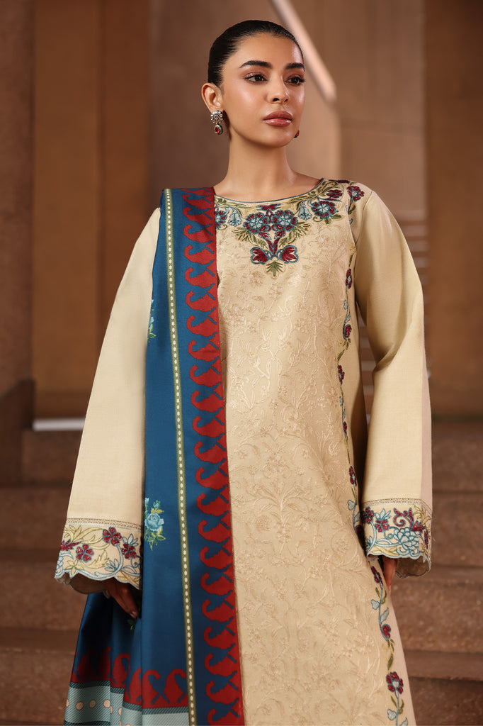 An elegant composition of subtle grace and refined detailing, this ensemble features an embroidered peach front paired with dyed peach sleeves and back. The look is enhanced by an embroidered border for sleeves and a beautifully crafted embroidered neck on organza, adding a touch of sophistication. Completed with a dyed peach trouser and a digital printed shawl, this outfit perfectly blends tradition with contemporary charm.