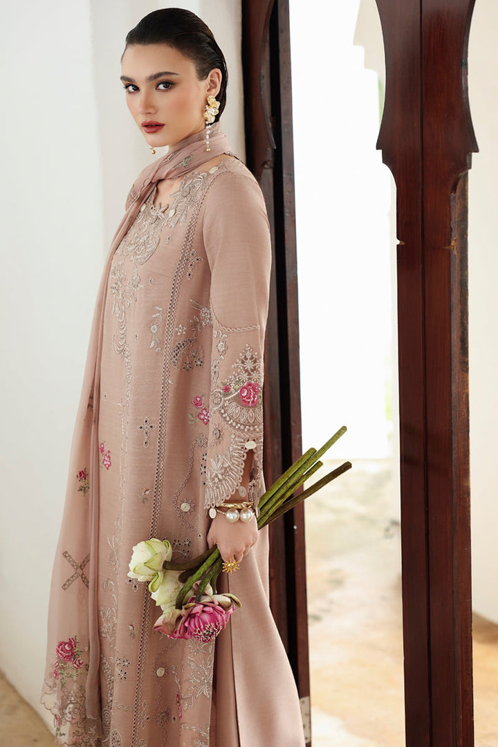 A graceful linen outfit with chikenkari embroidery, paired with an elegant embroidered chiffon dupatta and plain trouser.