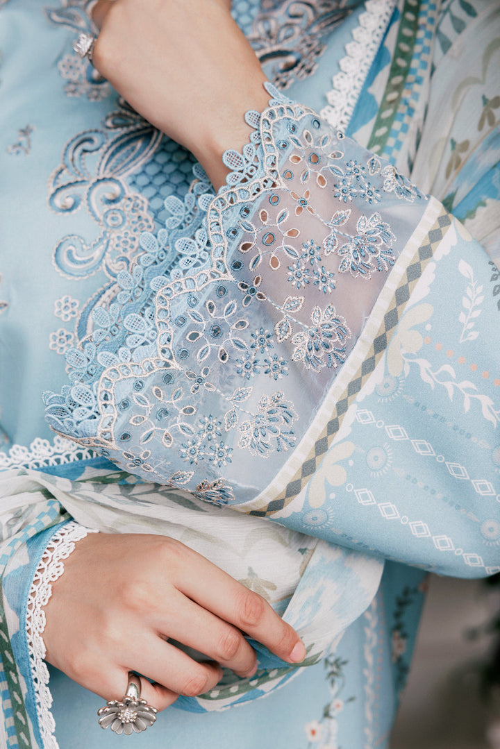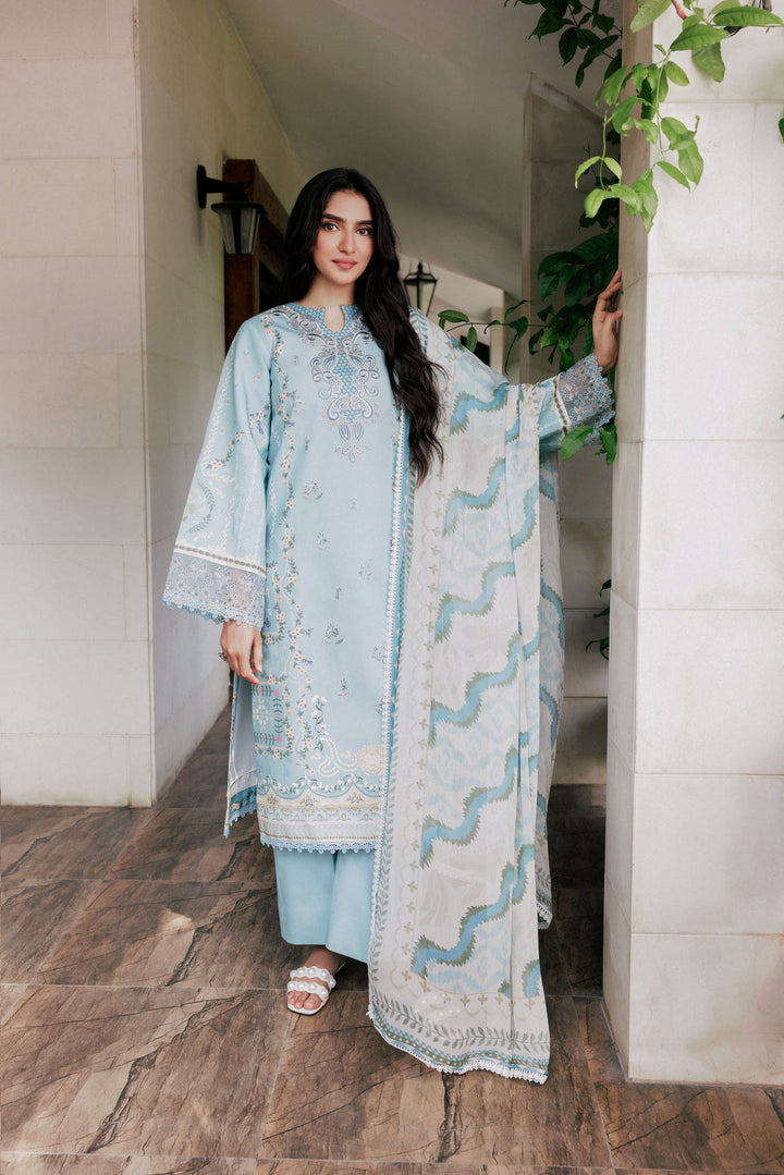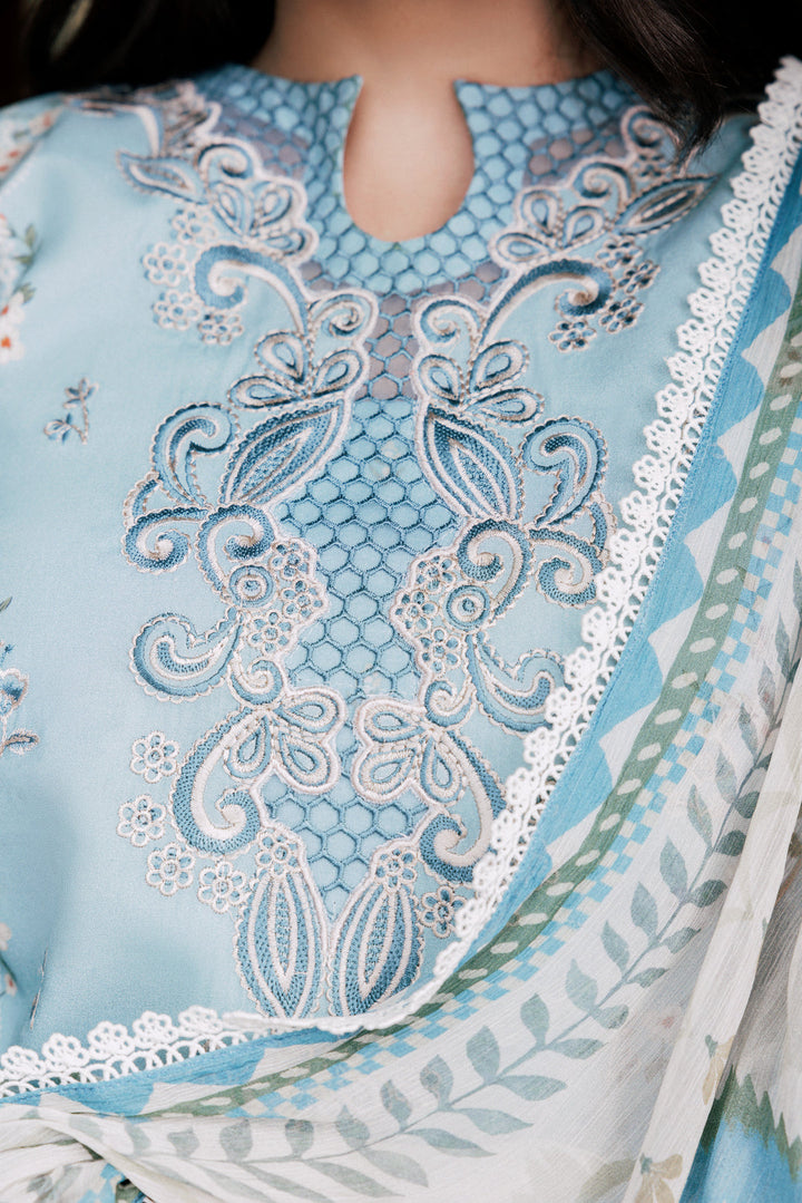 Chic digital printed viscose suit enhanced with embroidery, paired with chiffon dupatta and dyed trouser.