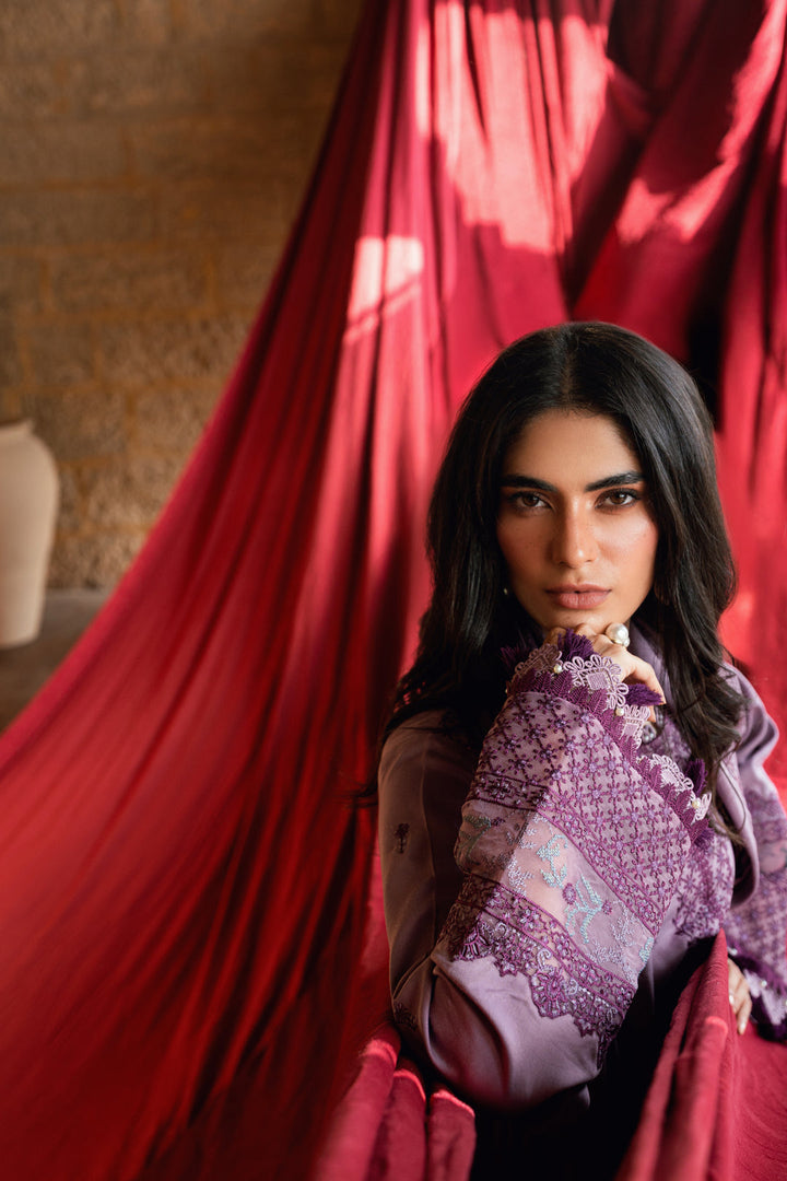 A graceful winter outfit adorned with detailed embroidery on the front, back, and sleeves, crafted on luxurious Marina Twill fabric. The ensemble features elegant embroidered borders and a beautifully designed Marina shawl with intricate pallus — a perfect blend of warmth and sophistication for the season.