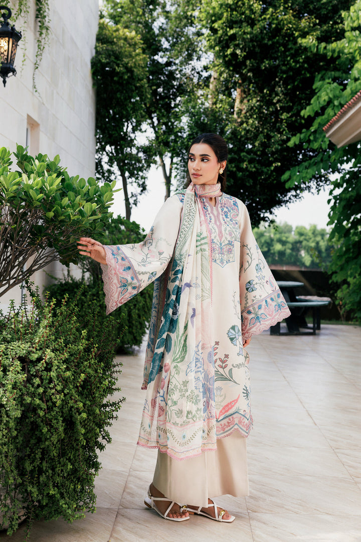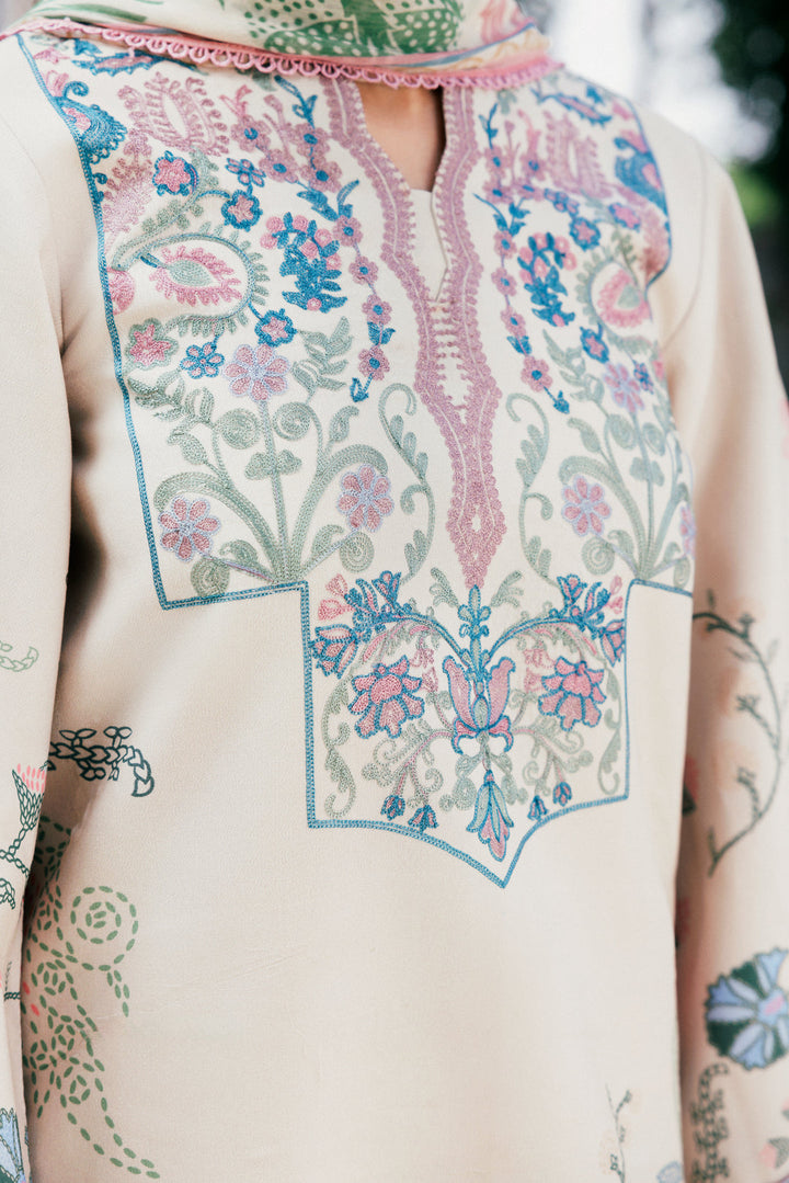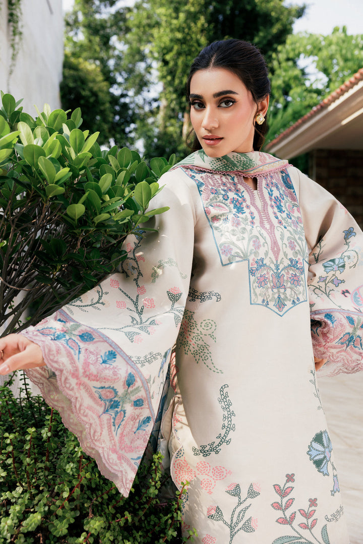 Elegant digital printed viscose suit enhanced with embroidery, paired with chiffon dupatta and dyed trouser.