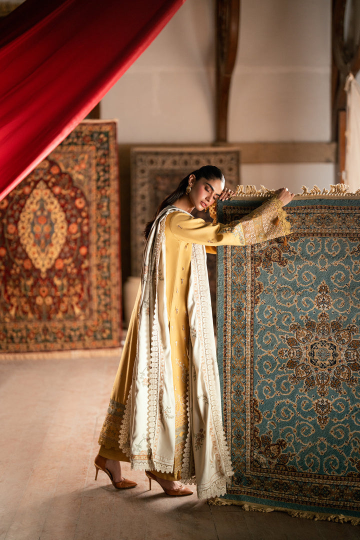 A graceful winter outfit adorned with detailed embroidery on the front, back, and sleeves, crafted on luxurious Marina Twill fabric. The ensemble features elegant embroidered borders and a beautifully designed Marina shawl with intricate pallus — a perfect blend of warmth and sophistication for the season.