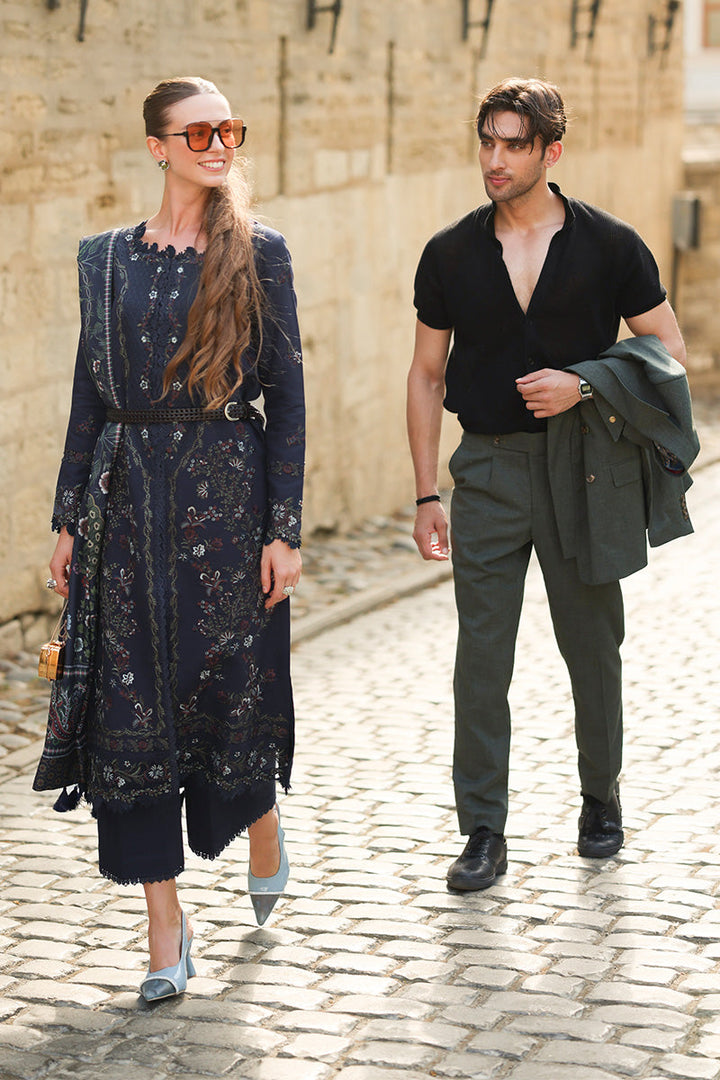 A timeless dobby linen ensemble that blends elegance with warmth. The beautifully embroidered front panels and sleeve borders showcase refined craftsmanship, while the soft linen fabric ensures comfort with a luxurious feel. Paired with a two-sided printed herringbone shawl, this outfit exudes sophistication — perfect for the winter season.