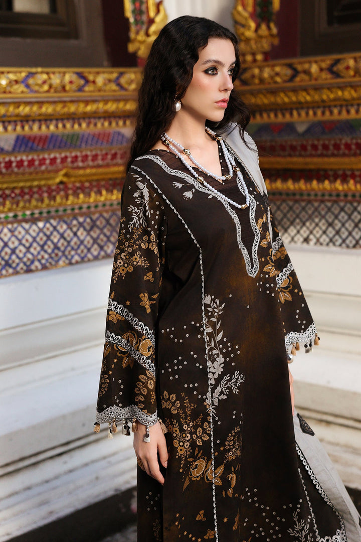 Stylish printed staple suit enhanced with fine embroidery and an elegant embroidered shawl.