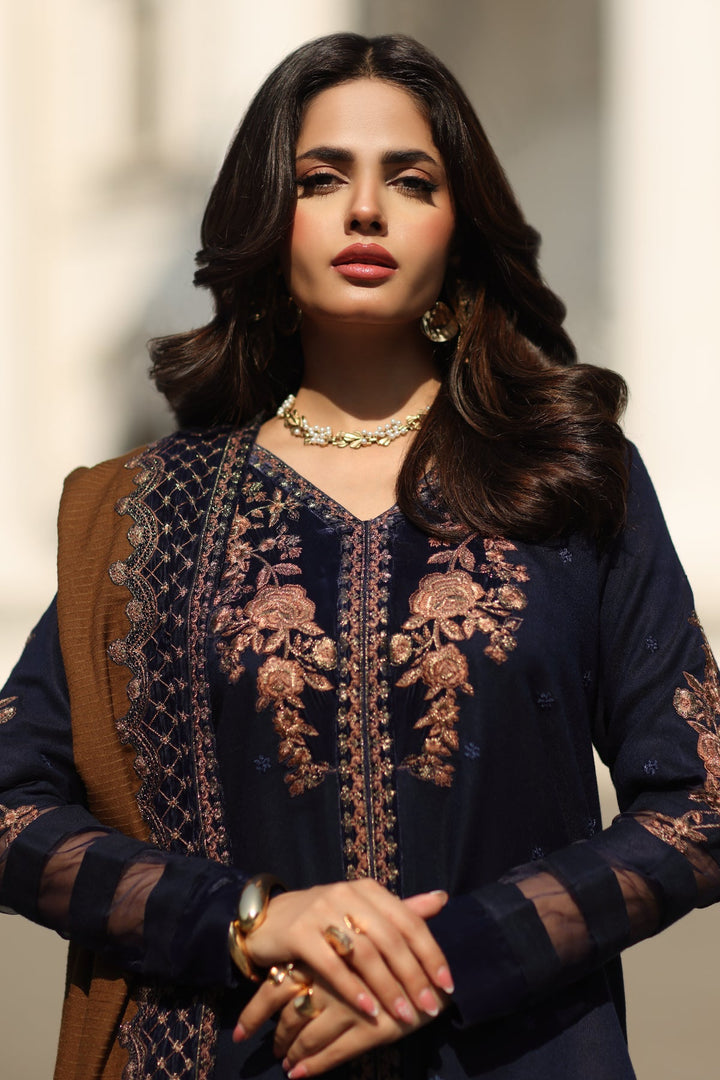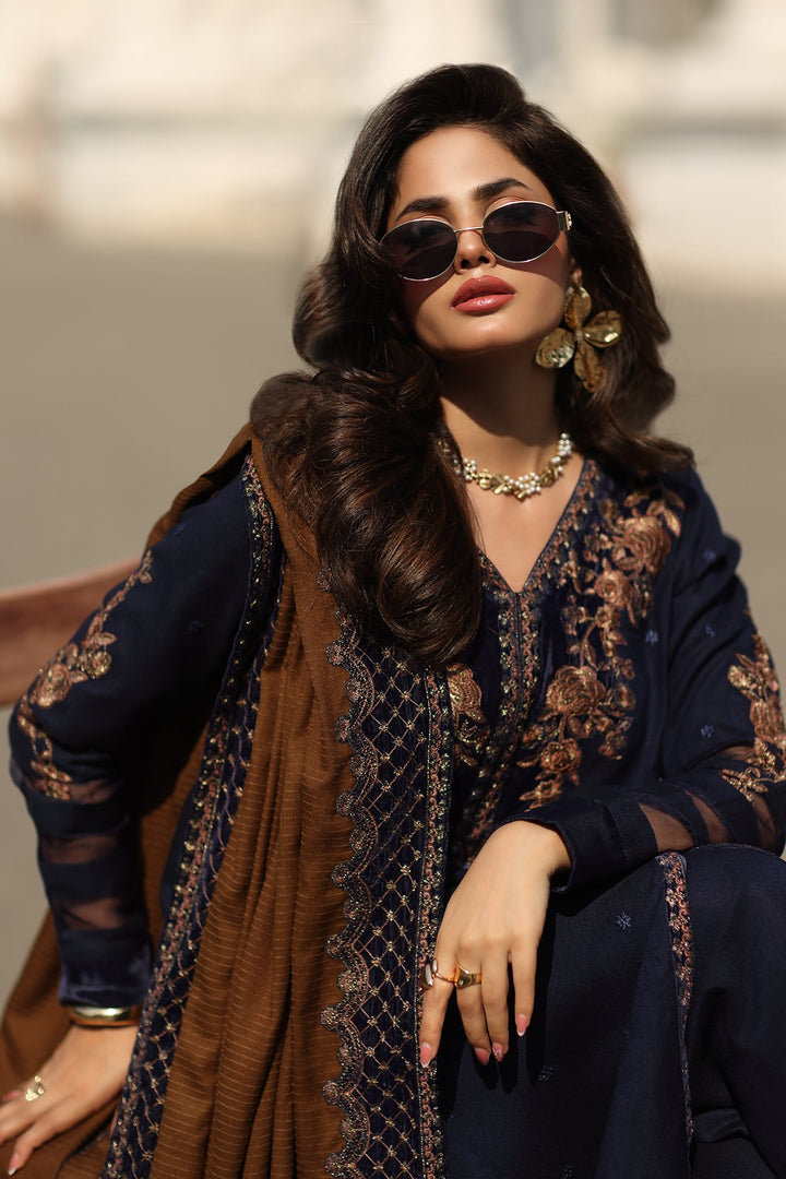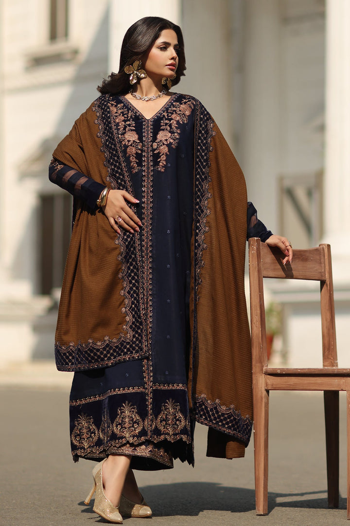 A symbol of luxury and refinement, this Embroidered Dyed Leather Suit is crafted with exquisite artistry and meticulous detailing. The embroidered front and sleeves on rich leather fabric create a graceful statement, complemented by a dyed leather back for a refined finish. Intricate embroidered motifs, daman and panel patti, and a beautifully crafted trouser patti enhance its elegance. The look is completed with a dyed wool shawl, adorned with an 8-meter embroidered patti, offering timeless sophistication and warmth — perfect for winter elegance.