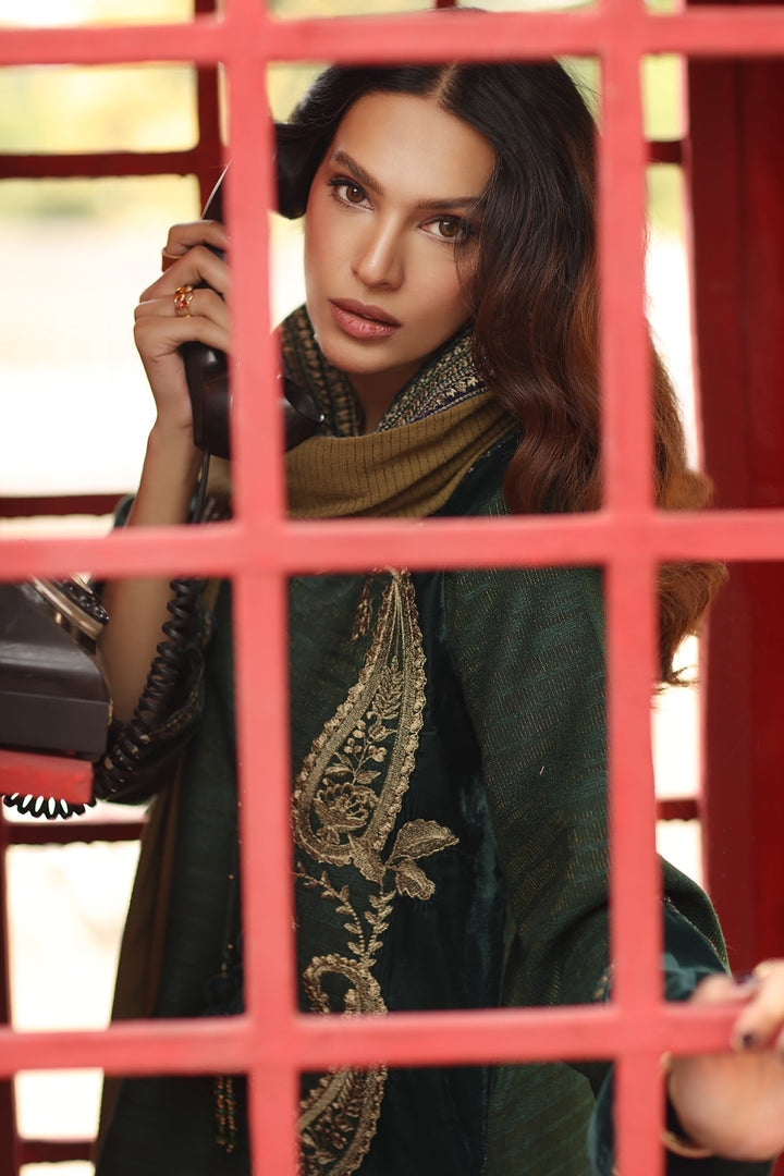 A refined winter outfit crafted on dyed leather fabric, delicately adorned with intricate embroidery and motifs. This ensemble exudes timeless elegance, paired with a warm wool shawl and detailed finishing to enhance its luxurious charm.