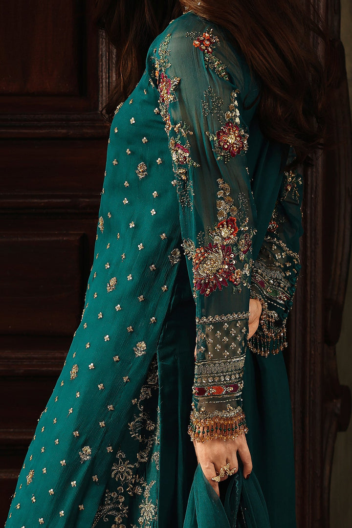 An opulent chiffon ensemble enriched with intricate embroidery and delicate adda work. The beautifully detailed front, sleeves, and neck patti exude luxury, while the embroidered net dupatta with pallu patti adds an ethereal charm. Perfectly paired with an embroidered raw silk trouser, this outfit is ideal for festive occasions and grand celebrations.