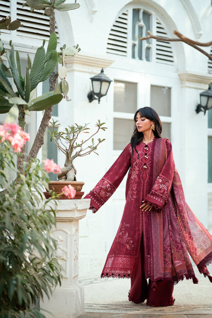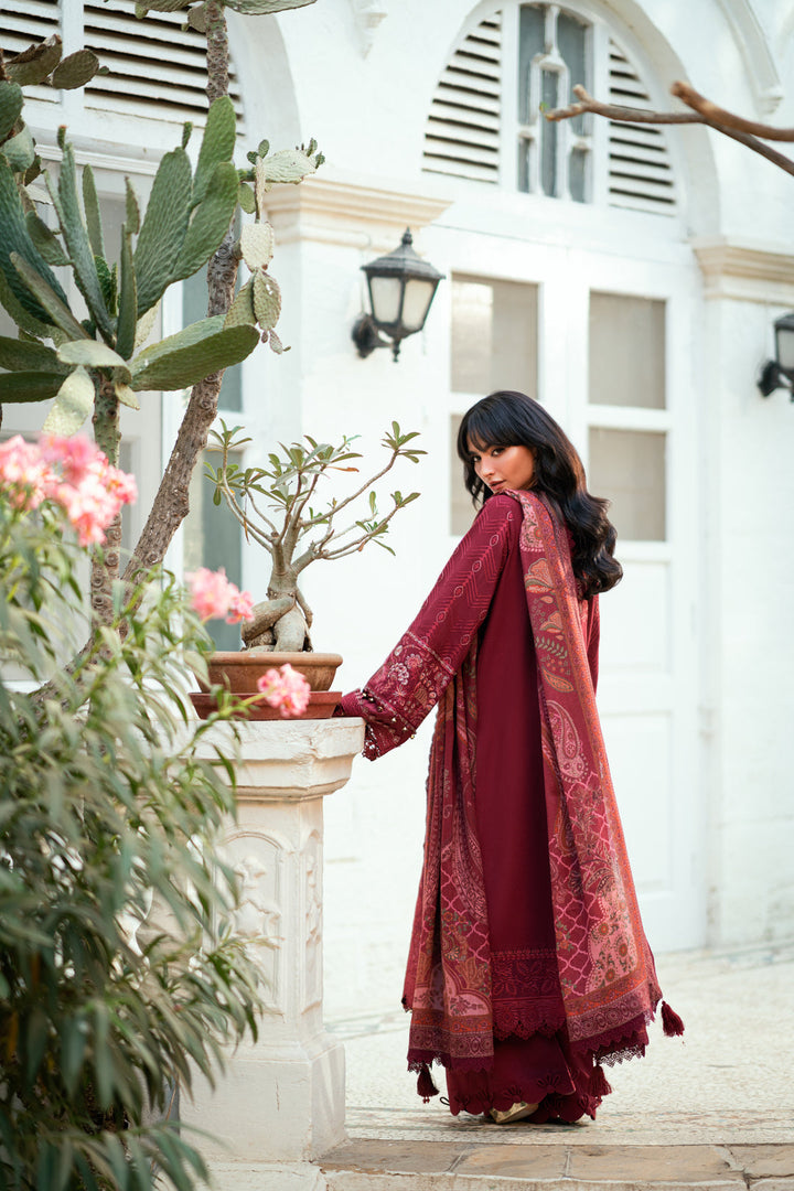 An exquisite Karandi outfit featuring delicate embroidery on the front, back, and sleeves. The refined embroidered borders and neckline motif add a touch of sophistication, beautifully paired with a digitally printed pure wool shawl that exudes warmth and elegance.