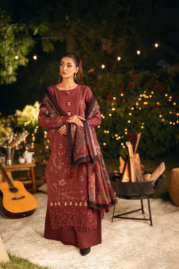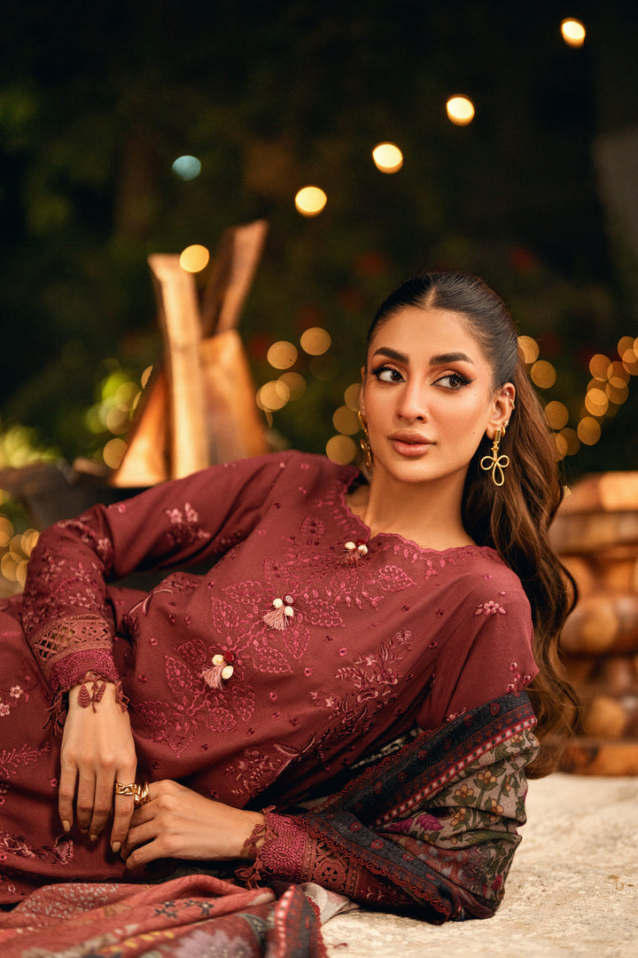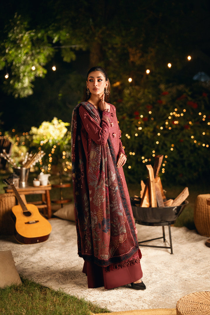 A timeless Karandi outfit crafted with intricate embroidery on the front, back, and sleeves. Enhanced with delicate embroidered borders and paired with a luxurious digital printed wool shawl, this ensemble perfectly balances warmth, style, and elegance for the winter season.