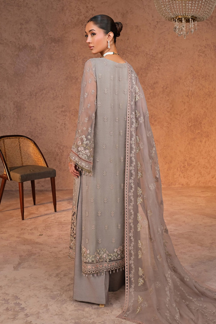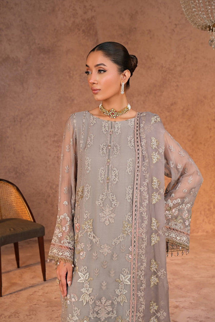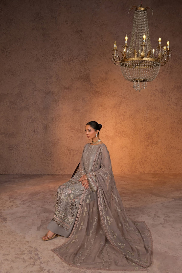 An elegant chiffon ensemble featuring intricate embroidery and organza borders — perfect for a timeless festive look.