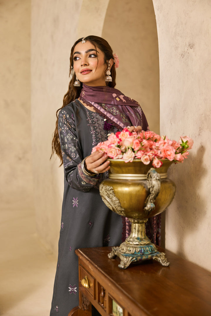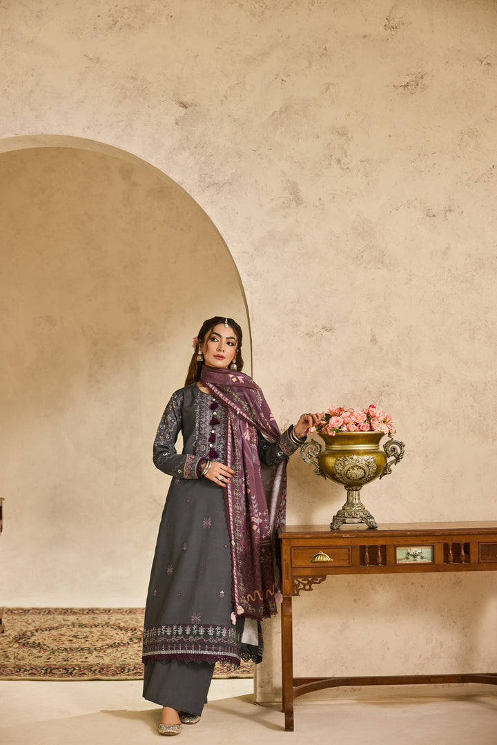 An elegant digitally printed khadi ensemble that exudes refined sophistication. The beautifully embroidered front is paired with a coordinated printed back and sleeves, creating a timeless look. Enhanced with an embroidered border for the sleeves and complemented by a digital printed khadi shawl, this outfit combines comfort, luxury, and classic winter charm.