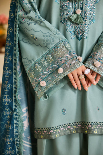 An exquisite digitally printed khadi ensemble that blends elegance with comfort. The embroidered front lends a touch of sophistication, beautifully complemented by the digitally printed back and sleeves. Enhanced with an embroidered border for the sleeves and paired with a soft digital printed khadi shawl, this outfit is perfect for refined winter styling.