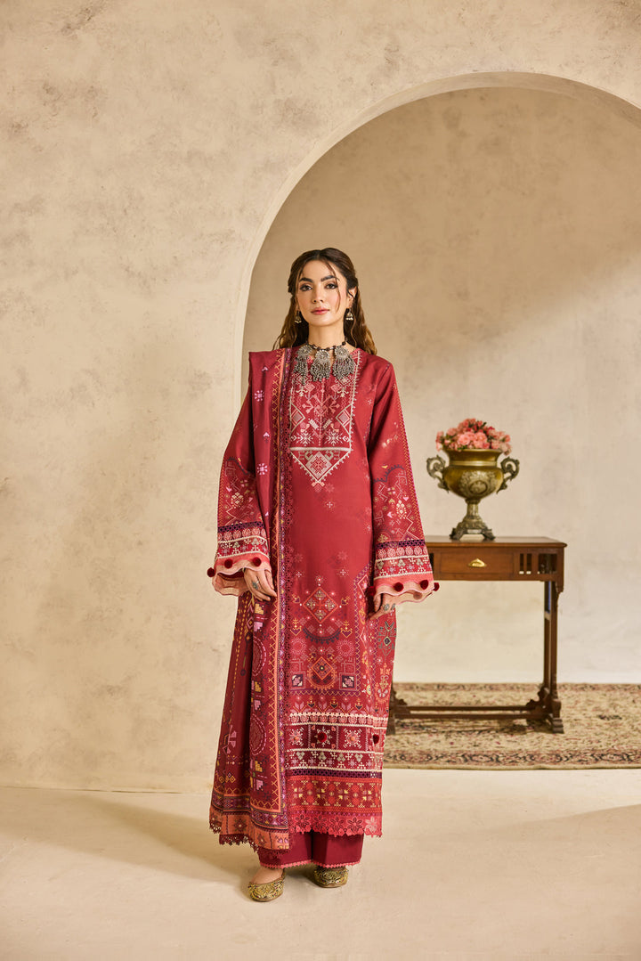 A beautifully composed digital printed khadi ensemble, designed to exude timeless elegance. The digitally printed front, back, and sleeves are accentuated with refined embroidered borders on the sleeves and hem for a touch of graceful charm. Paired with a soft digital printed khadi shawl and a dyed trouser, this outfit blends contemporary artistry with traditional sophistication — perfect for the winter season.