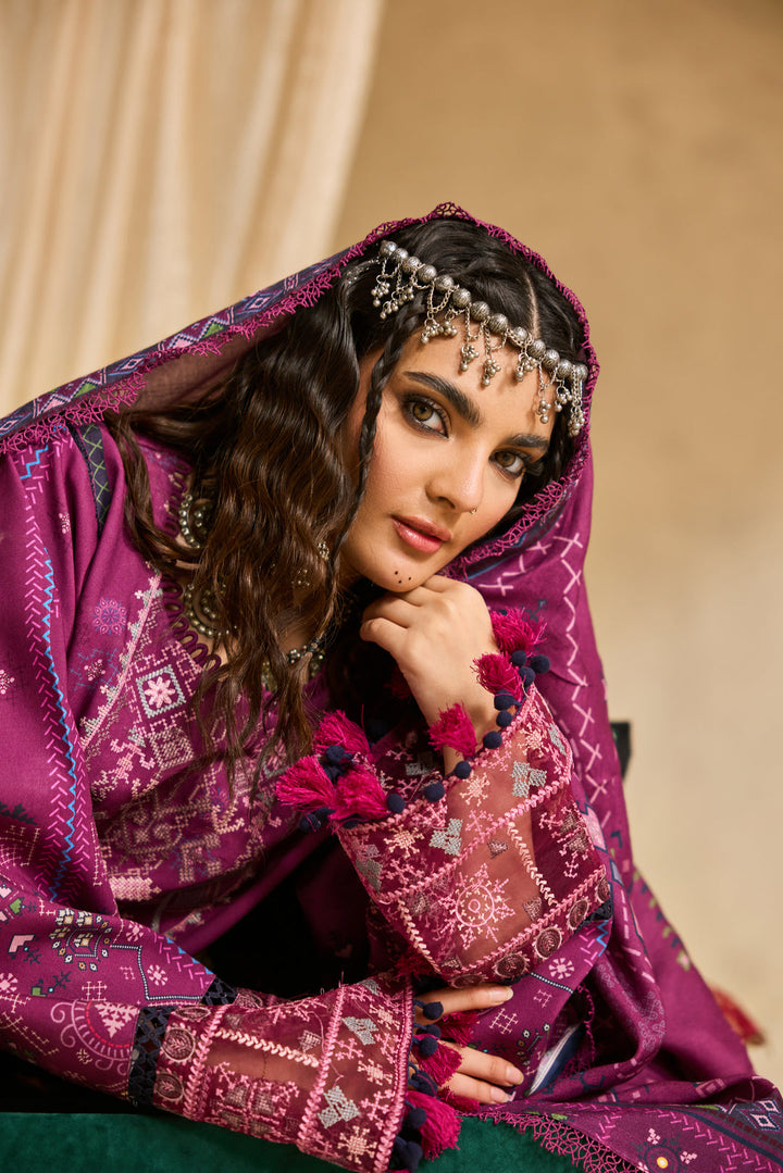 An elegant digital printed khadi ensemble that perfectly balances sophistication and comfort. The digitally printed front, back, and sleeves are beautifully complemented with intricate embroidered borders on the sleeves and hem, adding a refined finish to the look. Paired with a soft digital printed khadi shawl and dyed trouser, this outfit offers effortless style for both casual and festive winter wear.