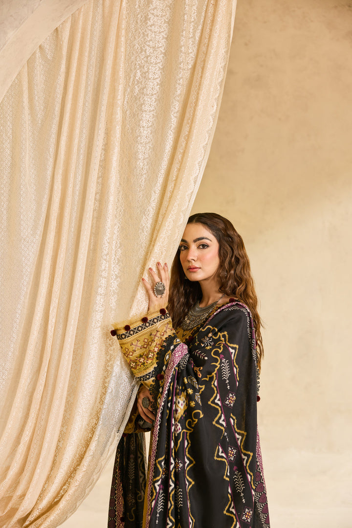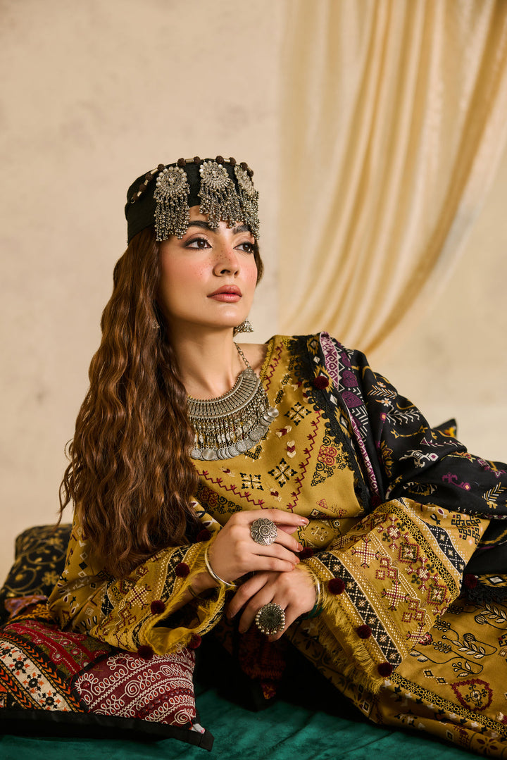 An exquisite khadi ensemble featuring a beautifully digital printed and embroidered front, perfectly paired with a coordinated printed back and sleeves. The look is elevated with a delicate embroidered sleeve border, adding a refined touch of craftsmanship. Completed with a digital printed khadi shawl and dyed trouser, this outfit is a graceful choice for elegant winter styling.