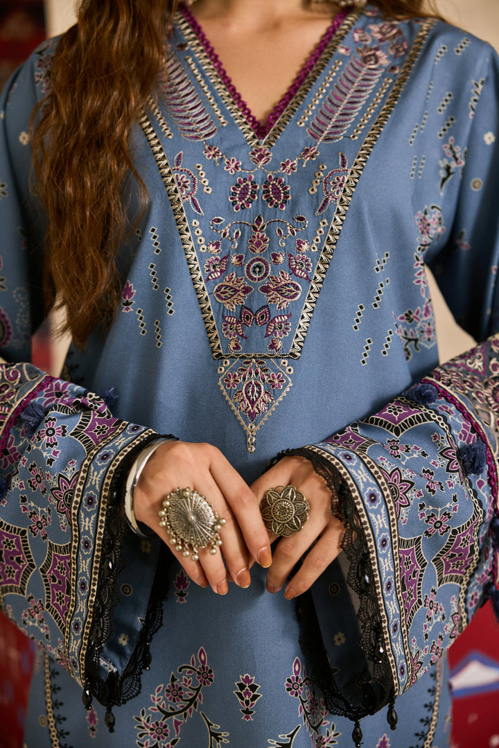 A graceful blend of artistry and comfort — this khadi ensemble features a digital printed and embroidered front with matching printed back and sleeves, enhanced by an embroidered sleeve border for a touch of refined detail. Paired with a digital printed khadi shawl and a dyed embroidered trouser, it’s the perfect choice for sophisticated winter style.