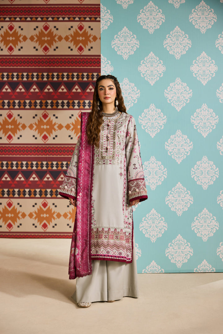 An exquisite blend of artistry and sophistication — this ensemble features a digital printed embroidered front paired with printed back and sleeves, creating a perfect harmony of color and design. The embroidered borders for sleeves and hem lend a touch of timeless grace, while the digital printed khadi shawl completes the look with effortless charm. Paired with a dyed trouser, this outfit is ideal for refined winter elegance.