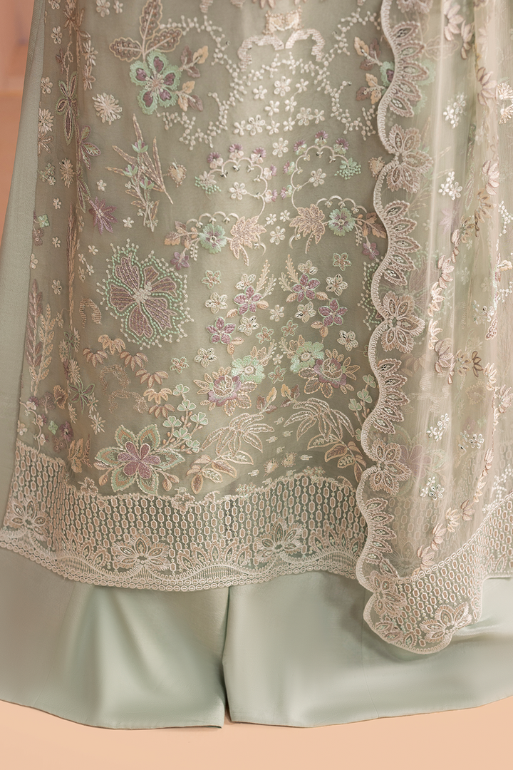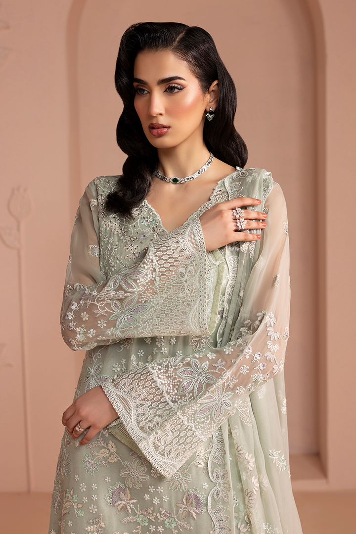 A refined chiffon ensemble adorned with intricate embroidery and handmade detailing, offering an elegant and luxurious festive look.