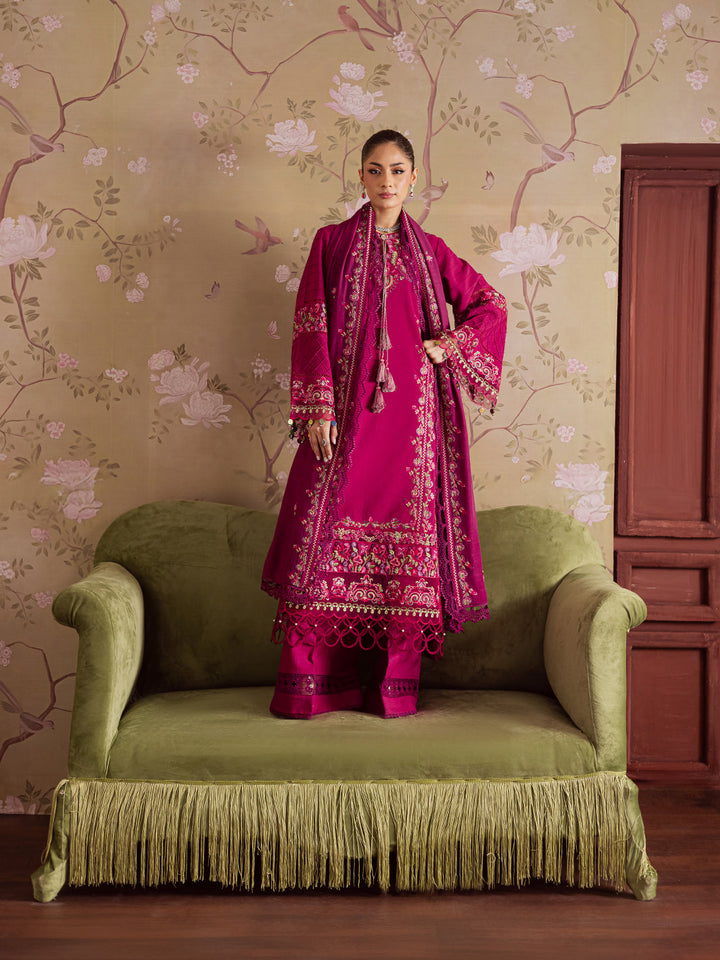 A refined khaddar outfit featuring an intricately embroidered front and bordered sleeves, perfectly complemented with an embroidered wool shawl. The look is completed with a plain dyed trouser and an embroidered patch for added detail, making it a graceful winter staple.