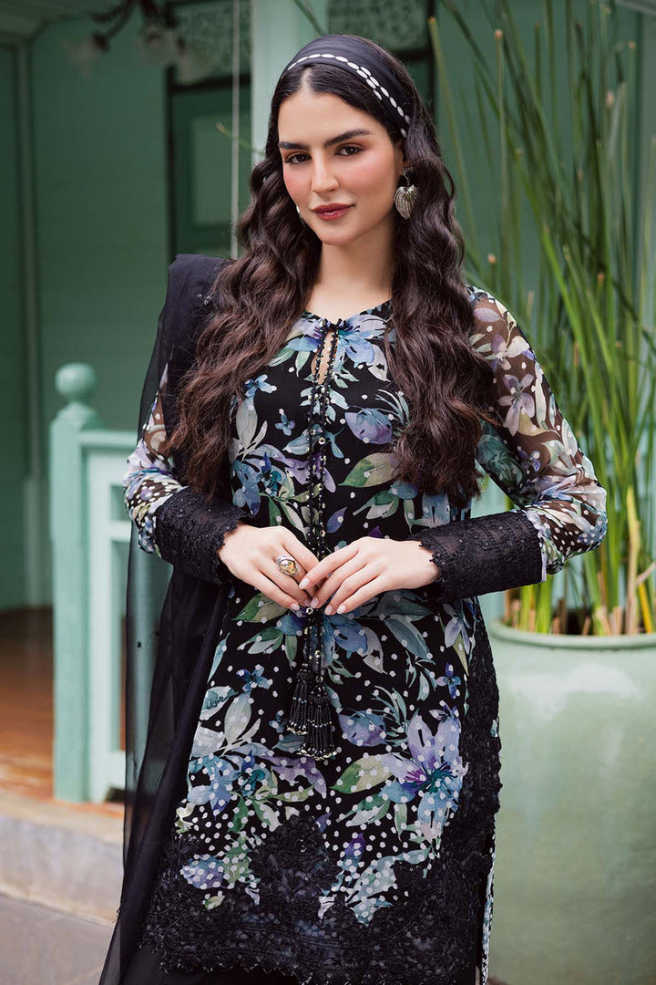 A luxurious printed and embroidered chiffon shirt paired with an exquisitely embroidered stitched organza dupatta and a dyed rawsilk trouser with inner — a graceful ensemble perfect for festive and formal wear.
