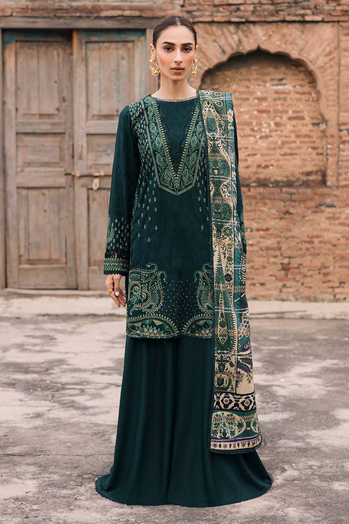 An elegant self-linen jacquard shirt adorned with intricate embroidery, beautifully complemented by a printed jacquard woolen shawl and a dyed linen trouser — crafted for refined winter sophistication.