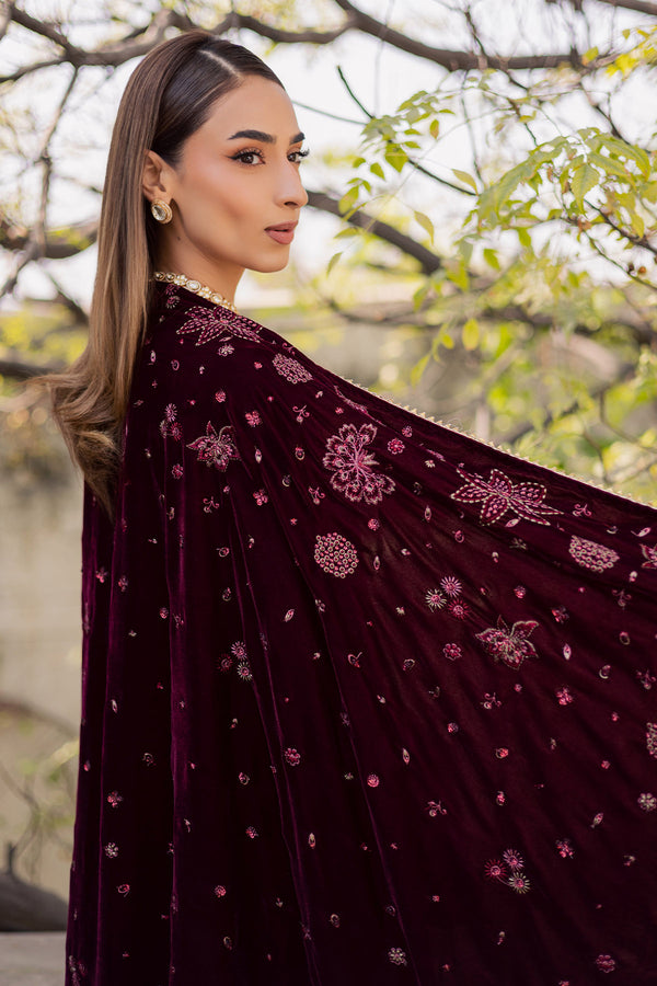 A stunning winter masterpiece crafted on rich dyed velvet fabric, featuring intricate embroidery, fine motifs, and a beautifully printed wool shawl — perfect for a warm yet elegant seasonal look.
