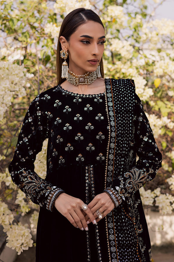 A stunning winter masterpiece crafted on rich dyed velvet fabric, featuring intricate embroidery, fine motifs, and a beautifully printed wool shawl — perfect for a warm yet elegant seasonal look.