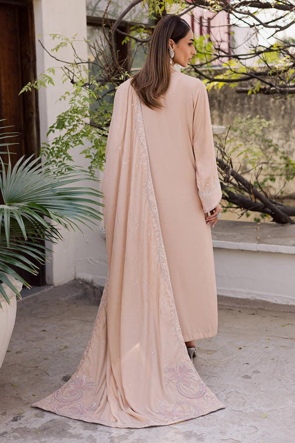 A stunning winter masterpiece crafted on rich dyed velvet fabric, featuring intricate embroidery, fine motifs, and a beautifully printed wool shawl — perfect for a warm yet elegant seasonal look.