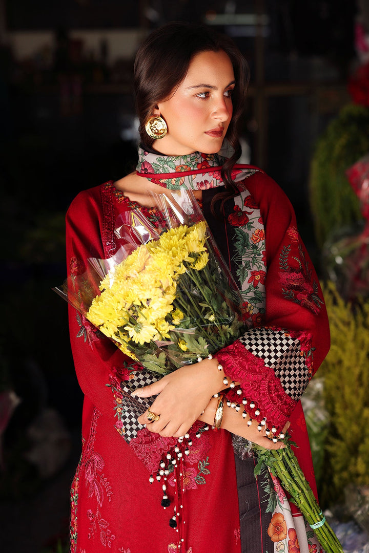 An elegant dyed leather ensemble showcasing refined embroidery on the front, neck, and daman. The intricate patti work and back motif lend a touch of sophistication, while the soft printed wool shawl enhances its timeless charm — a perfect outfit for formal and festive winter occasions.