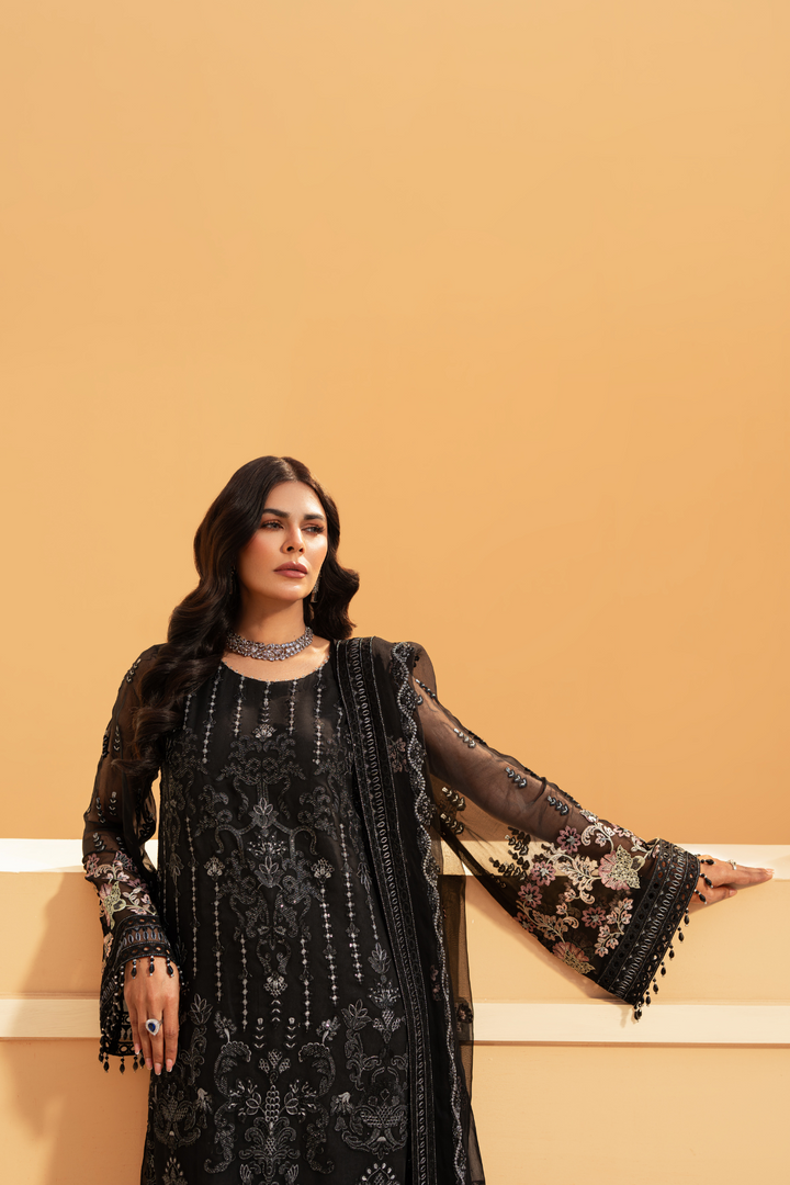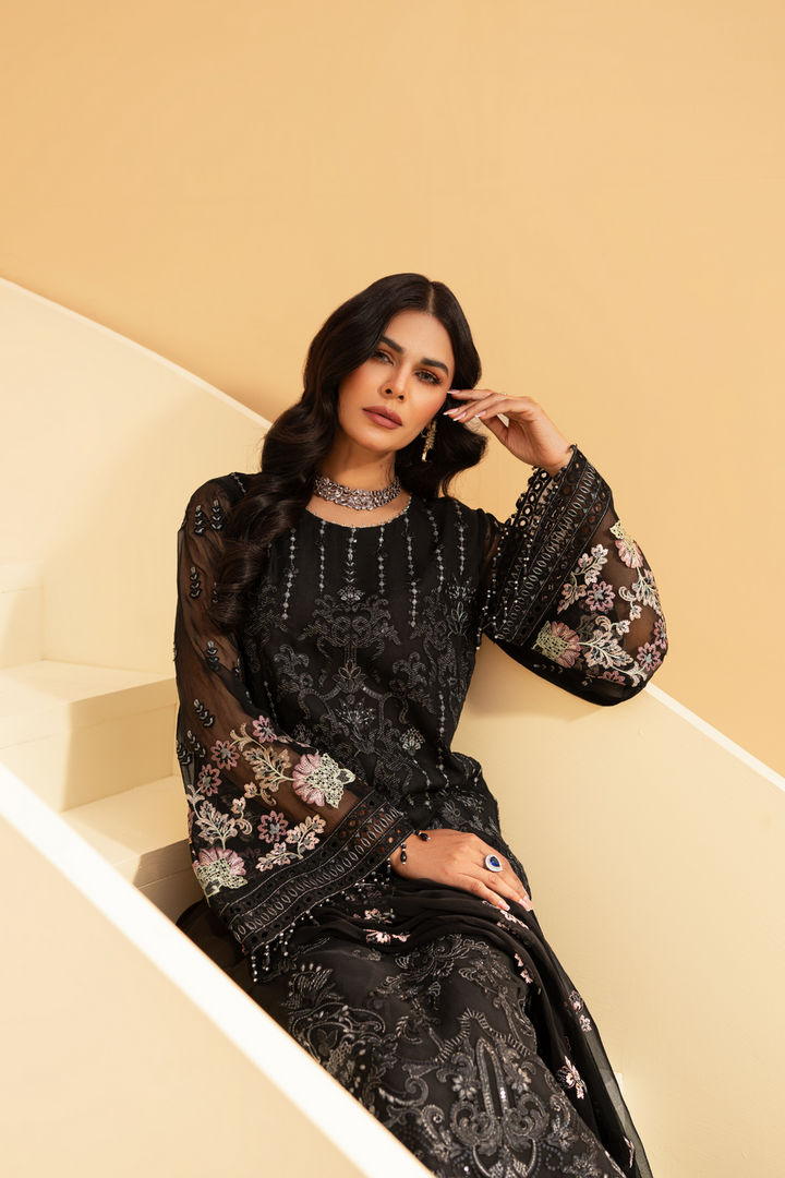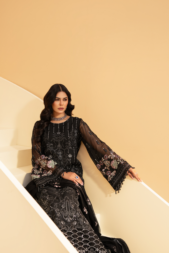 A luxurious chiffon ensemble with exquisite embroidery and organza detailing — perfect for a timeless, elegant look.