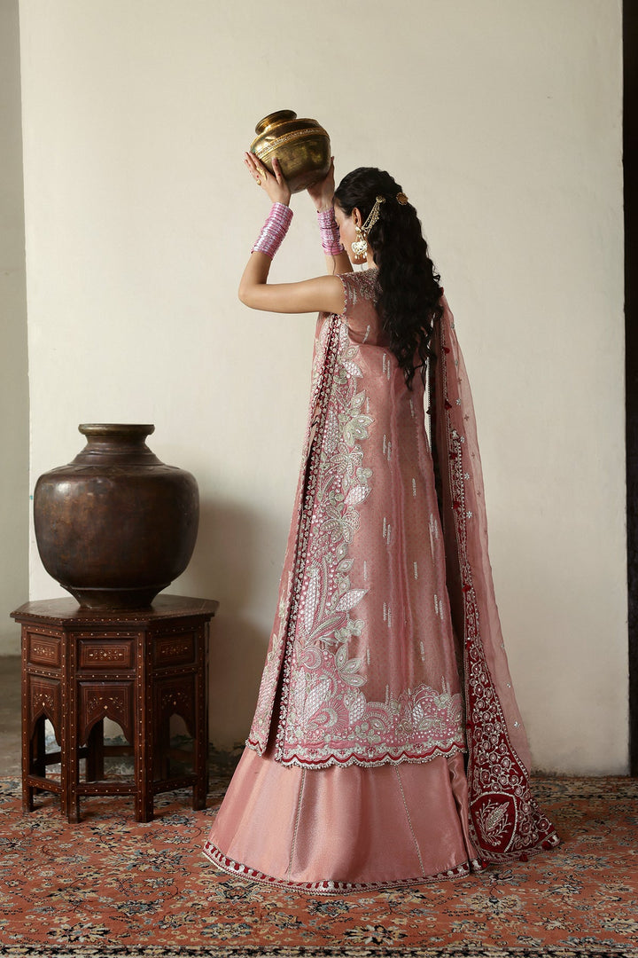 A regal pink tissue zari and raw silk creation with intricate embroidery, digital prints, and contrasting maroon detailing, beautifully paired with a kundan net zari dupatta and tailored trouser.